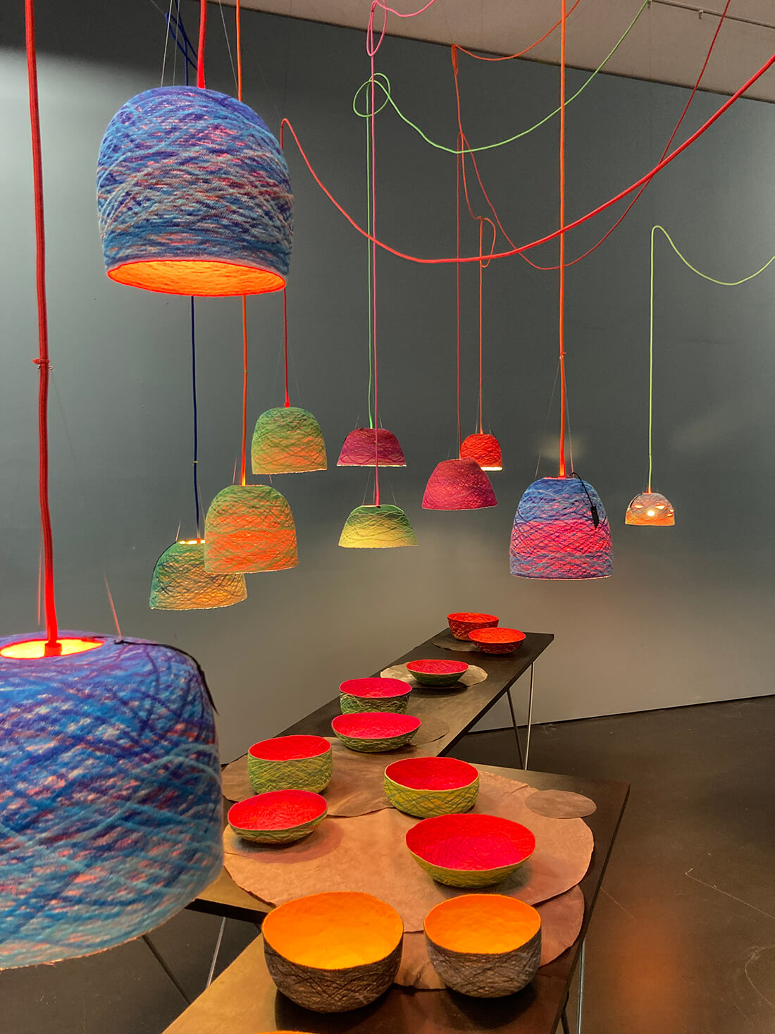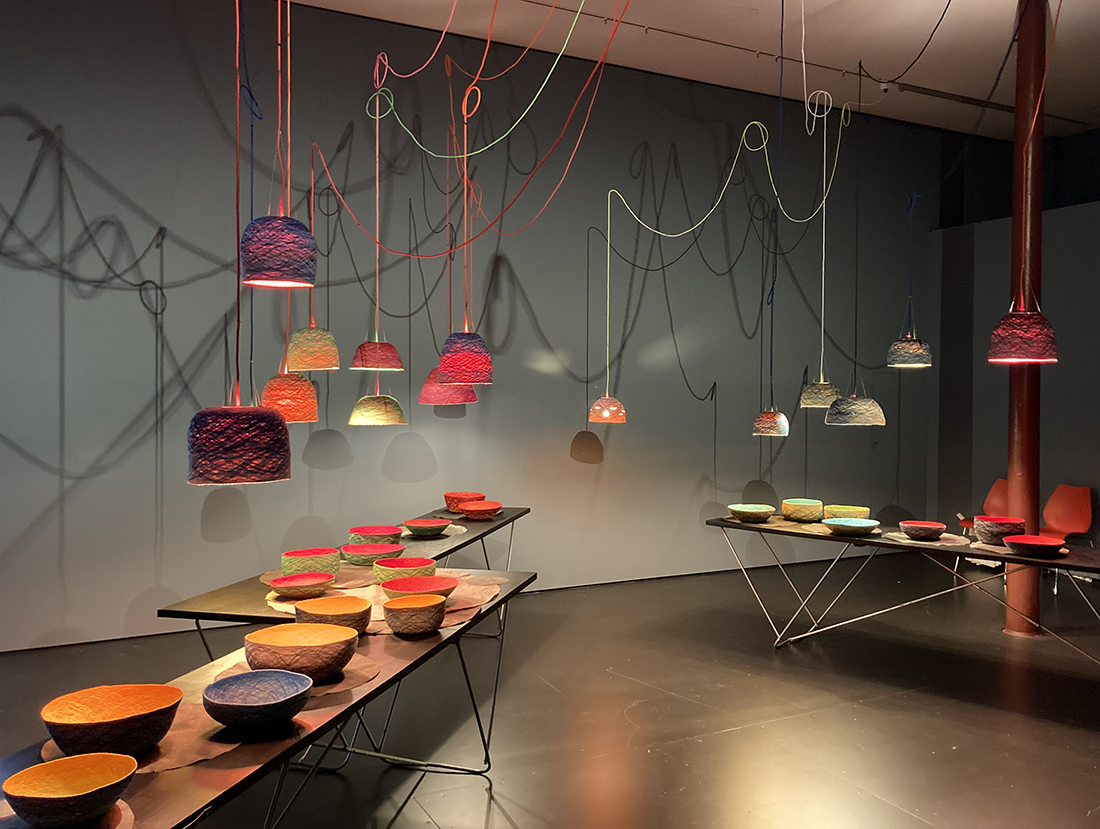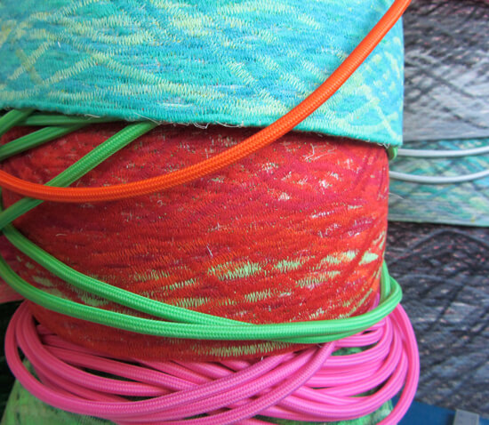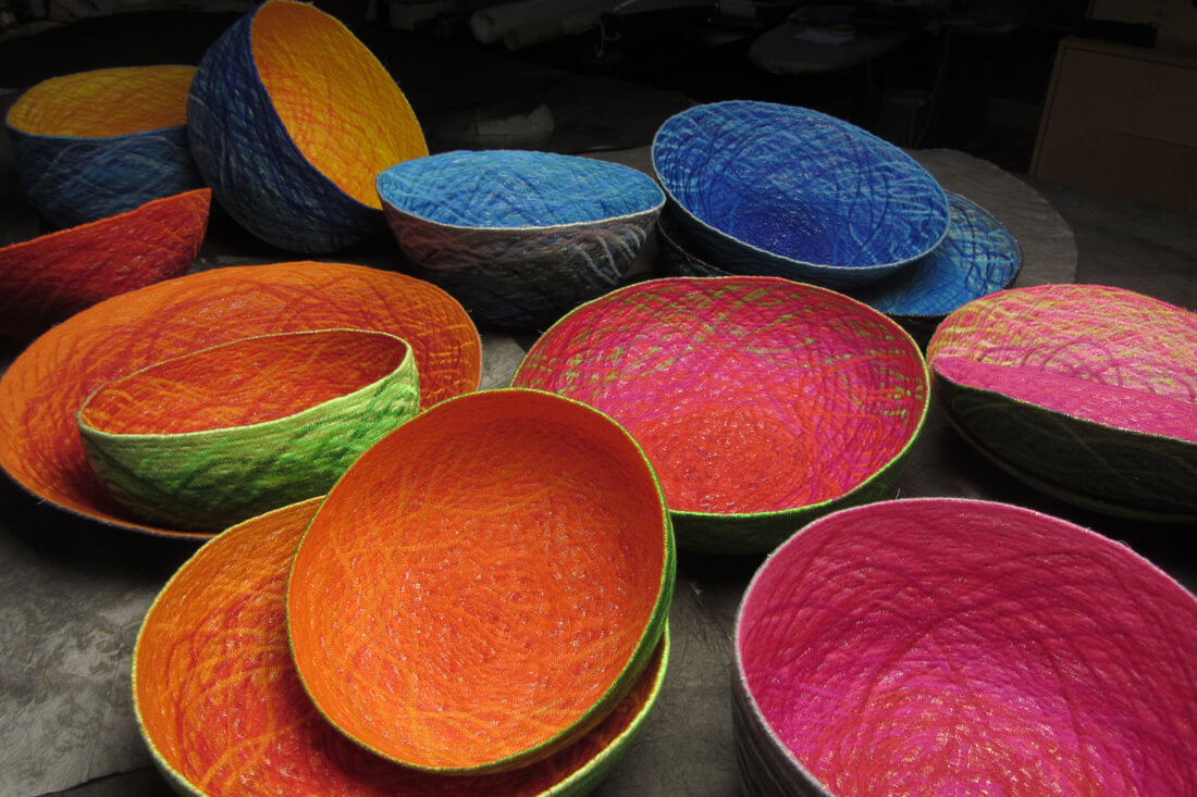 materials: sewing thread and sisal cord. the sisal cord, the fibre of agave leaves, is sewn together in a spiral. the strength and colourfulness of the bowl is the result of multiple zigzag stitches. the upper thread provides the colour of the bowl interior, the lower thread colours the outside. the bowl is for bread, odds & ends, nuts, fruit, keys, jewellery... and light.